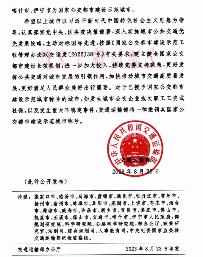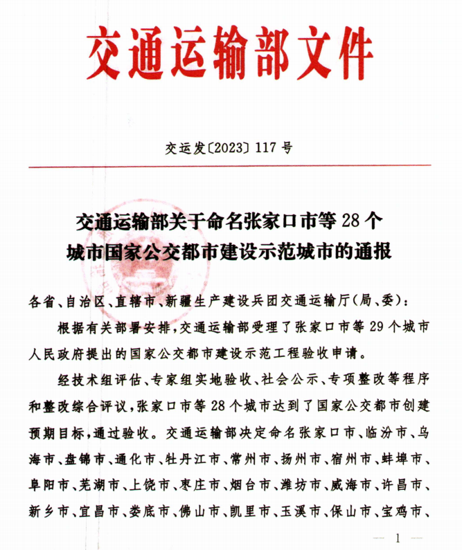 根據(jù)市委市政府安排部署,市交投公司子公司市通途公司積極開展公交都市創(chuàng)建籌融資和公交站場(chǎng)建設(shè)等工作,經(jīng)交通運(yùn)輸部技術(shù)組評(píng)估、專家組實(shí)地驗(yàn)收、社會(huì)公示、專項(xiàng)整改等程序和整改綜合評(píng)議,我市達(dá)到了國(guó)家公交都市創(chuàng)建預(yù)期目標(biāo)。2023年8月22日,交通運(yùn)輸部正式命名我市為國(guó)家公交都市建設(shè)示范城市。