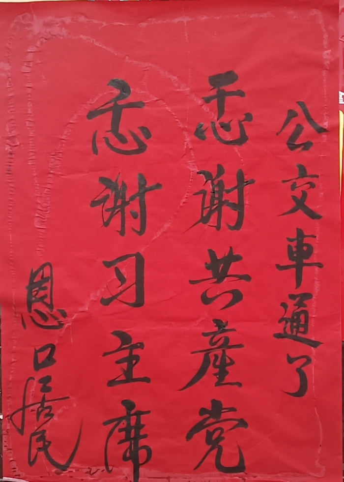“公交車通了,感謝共產(chǎn)黨,感謝習(xí)主席。”10月11日,一張鮮艷的大紅紙張貼在恩口車站門口,感謝語下面的落款為恩口居民。自10月9日恩口線路公交車試運營以來,交通環(huán)境的改善就不斷地收到當(dāng)?shù)鼐用竦?/span>稱贊。
